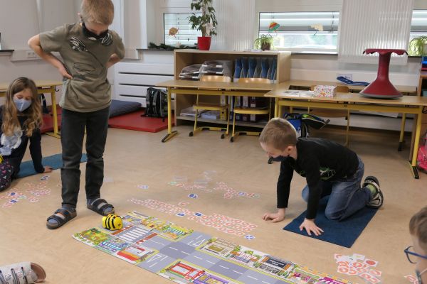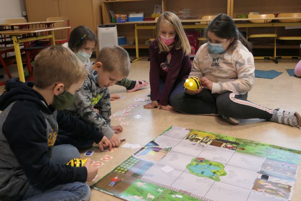 Nachdem die Kinder der Waldklasse sich im Rahmen des Mathematikunterrichts intensiv mit Lagebeziehungen und Wegbeschreibungen beschäftigt hatten, erhielten sie Besuch von den „Bee-Bots“. Diese Lernroboter in der Gestalt einer Biene lassen sich über Tasten auf ihrem Rücken programmieren. Doch bevor es los gehen kann, muss man sich erst einmal genau überlegen, wohin die Biene eigentlich laufen soll…