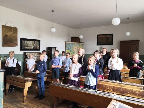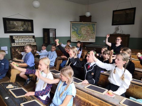 Wie kann Unterricht ohne digitale Tafel, ohne Schulhefte und auch ohne bunte Bücher funktionieren? Das haben die Kinder der 4. Klasse bei ihrem Besuch im Schulmuseum nachempfunden. Natürlich hatten alle ein weißes Taschentuch dabei und waren passend gekleidet!