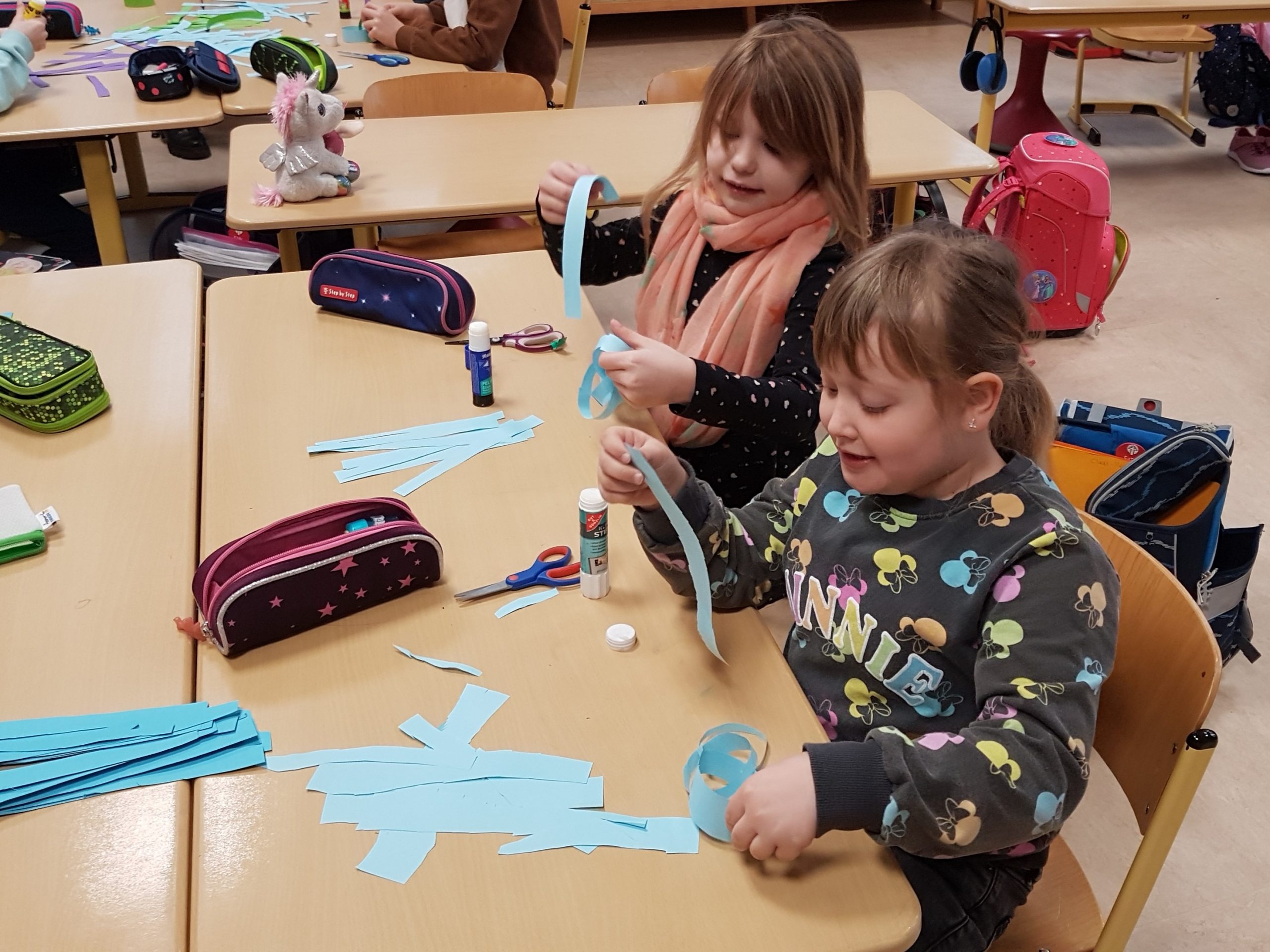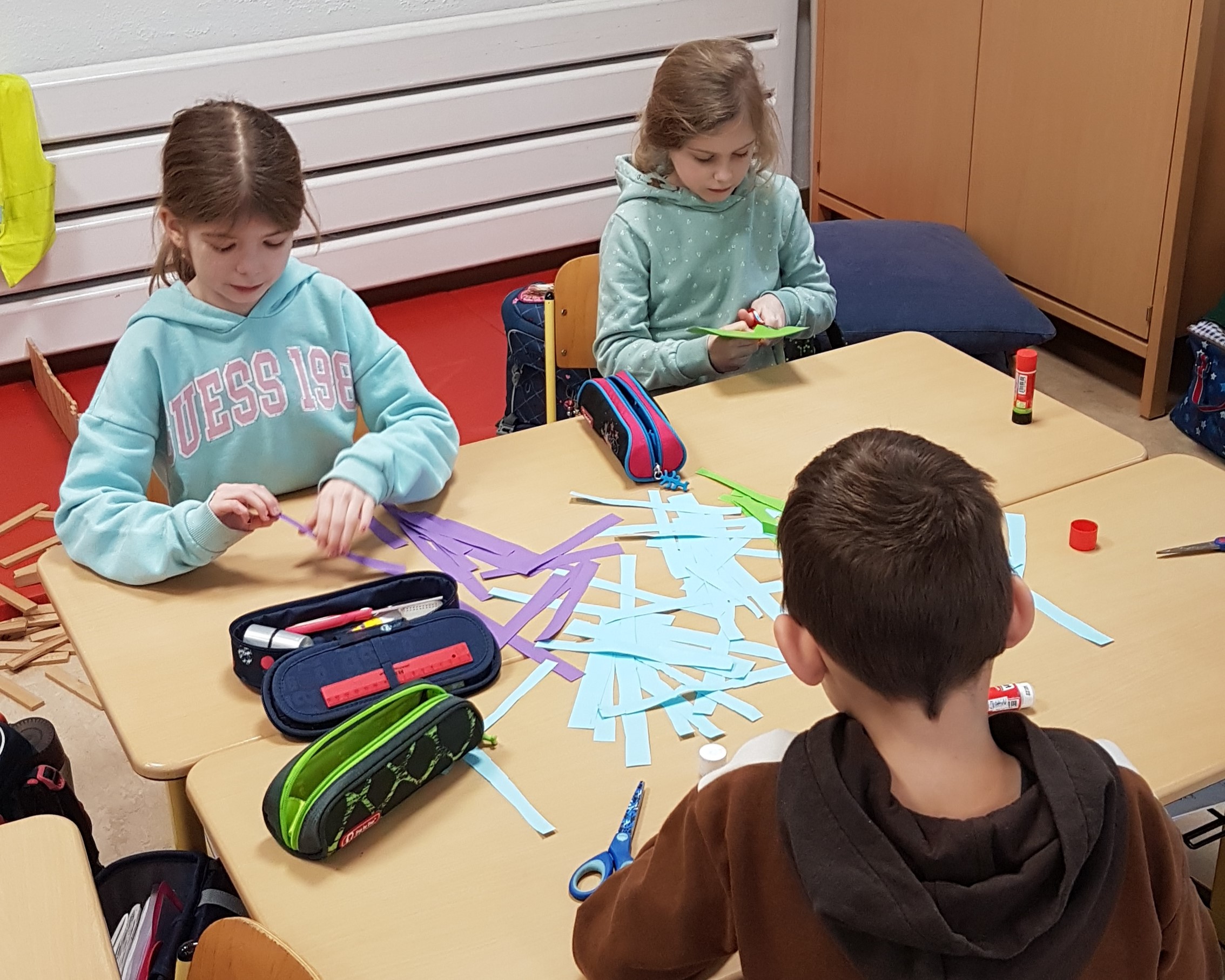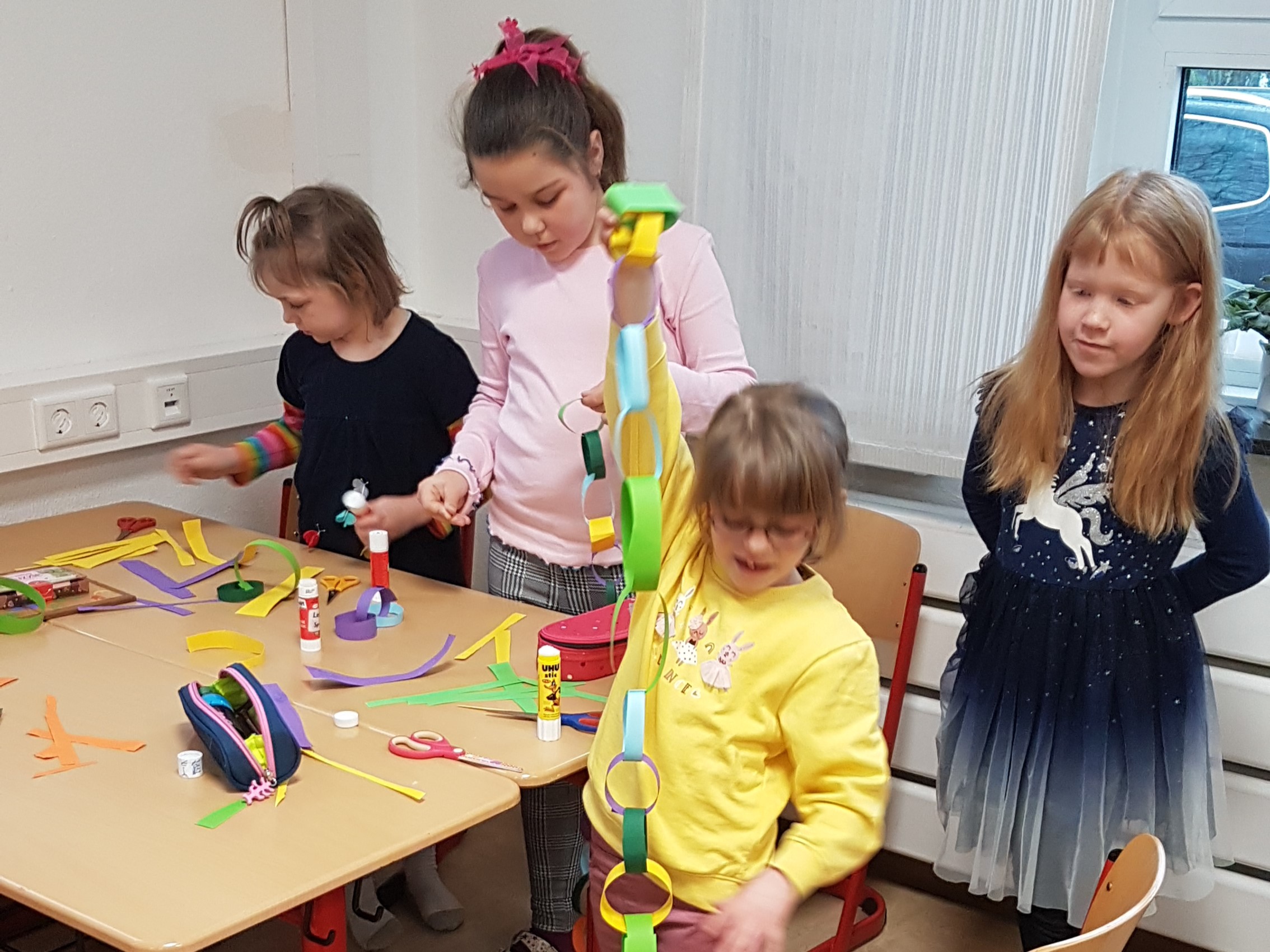 In diesem Jahr haben die Waldkinder den Karnevalsschmuck für ihre Klasse selbst hergestellt: Mit meist guter Arbeitsteilung haben sie in kleinen Gruppen fast unendlich lange Girlanden produziert.