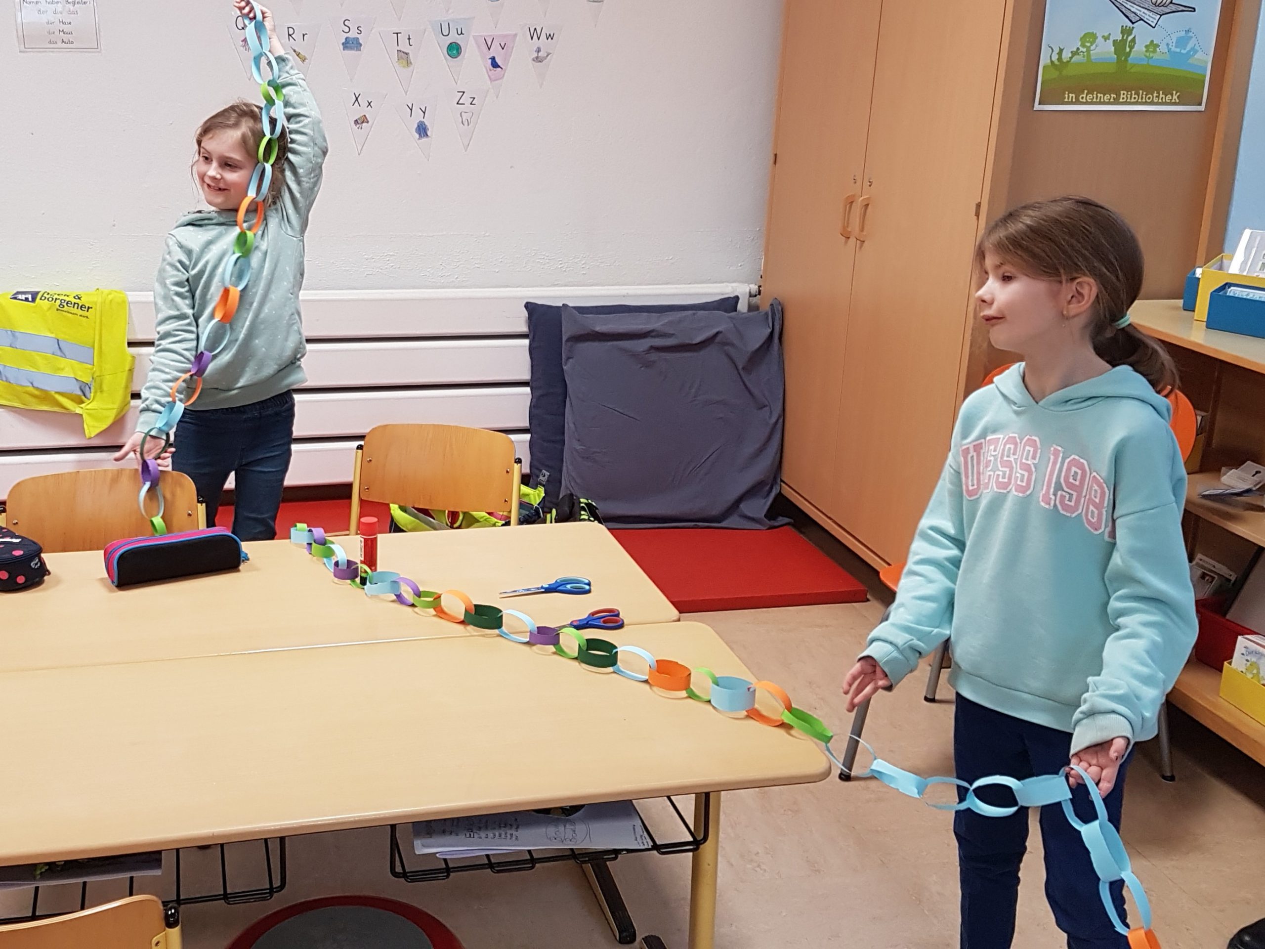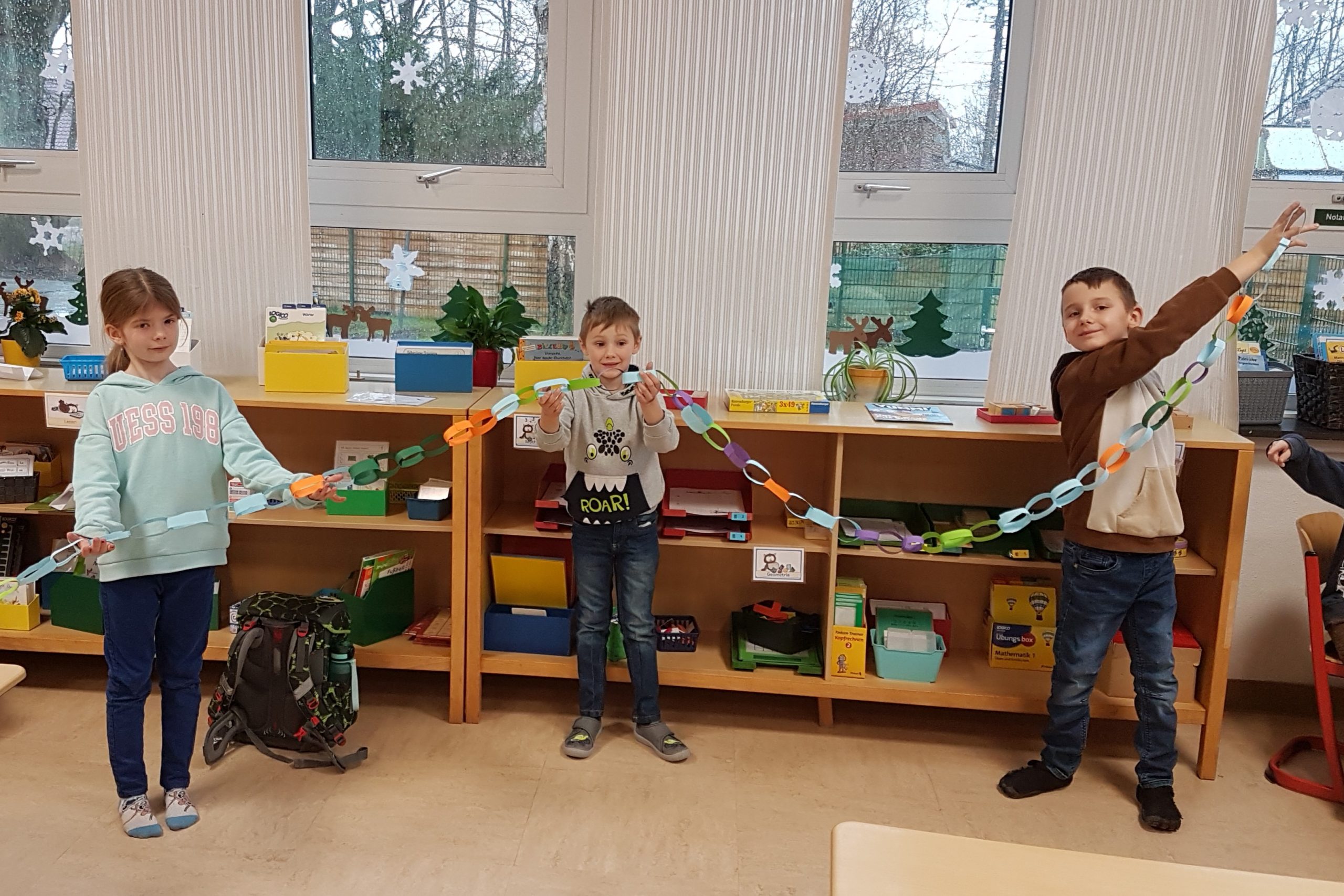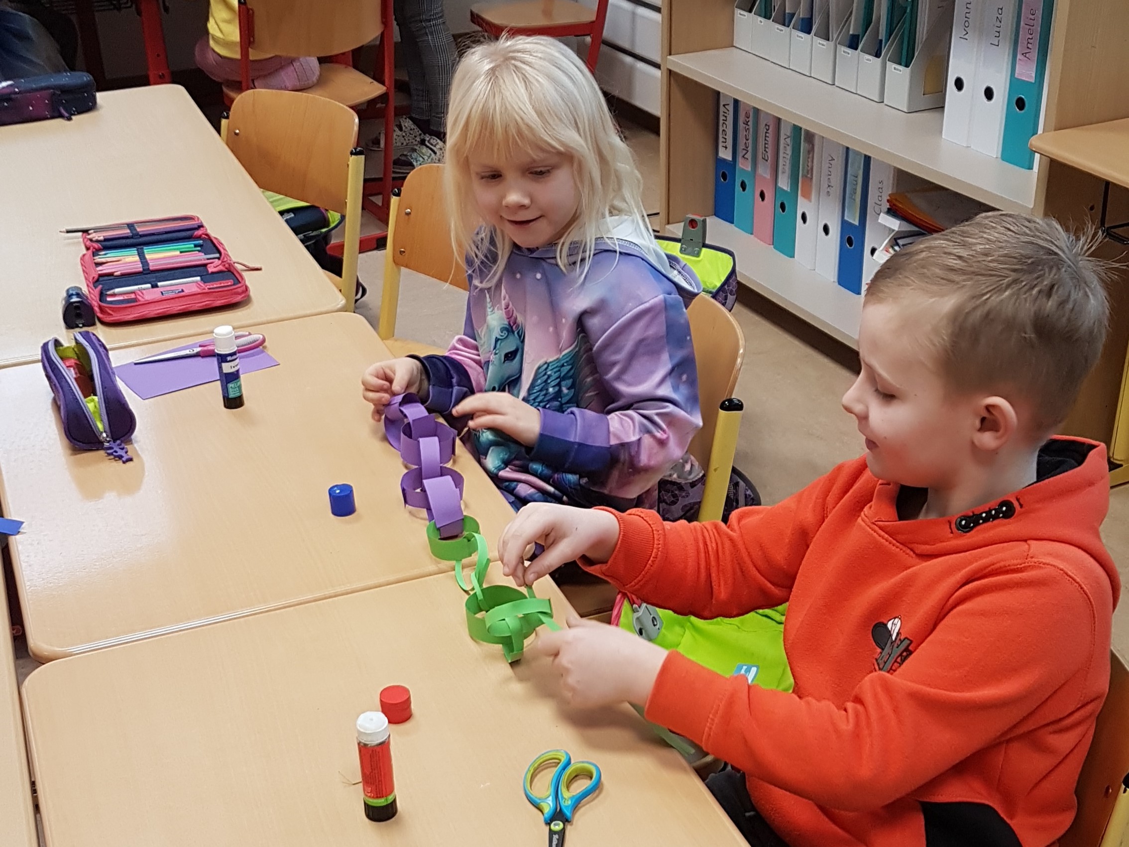 In diesem Jahr haben die Waldkinder den Karnevalsschmuck für ihre Klasse selbst hergestellt: Mit meist guter Arbeitsteilung haben sie in kleinen Gruppen fast unendlich lange Girlanden produziert.