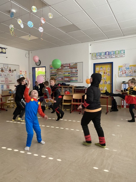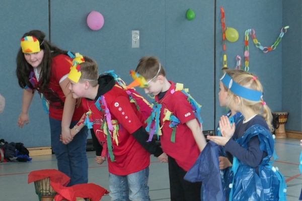 Diese Jahr hat den Kindern die Karnevalsfeier ganz besonders gut gefallen, denn sie wurde im Rahmen eines Projekttages von ihnen selber vorbereitet: Deko wurde gebastelt, Plätzchen gebacken und das Buffet geplant, eine Bewegunslandschaft erstellt, Spiele überlegt, Discolieder und -spiele rausgesucht und noch einiges mehr. Dabei haben sich die Erwachsenen zurückgehalten und den Kindern des Zepter überlassen. Am Rosenmontag konnte alle sagen: “Daumen hoch – das haben wir gut hingekriegt!”