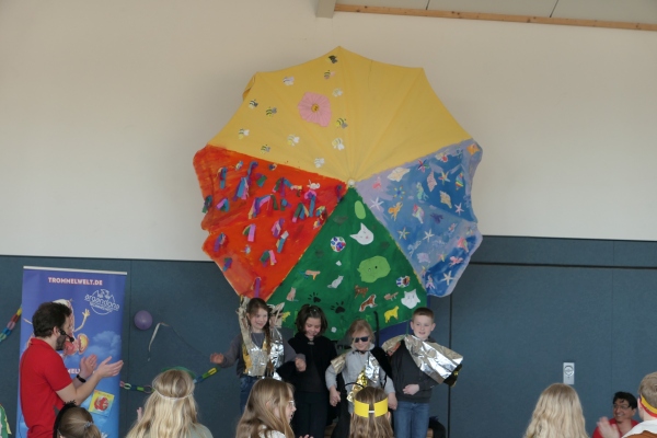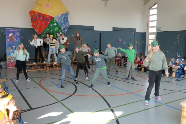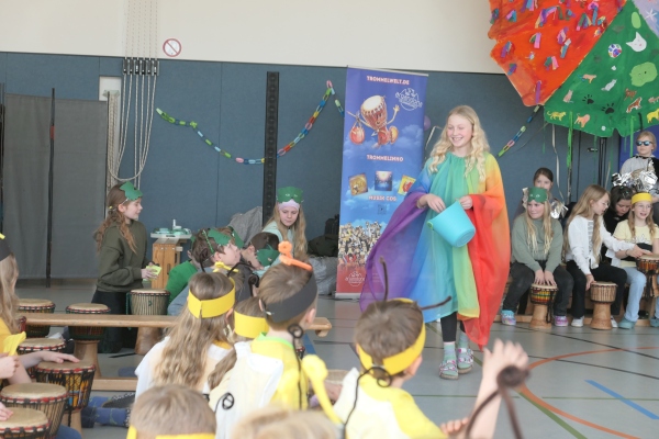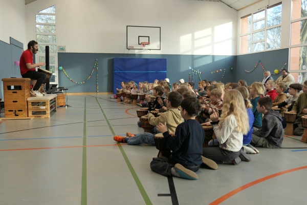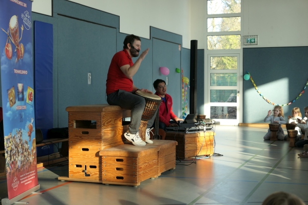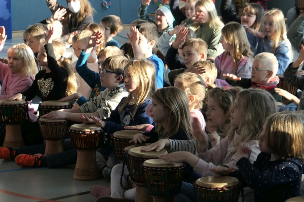 “Ich – bin super, du – bist super, wir – sind super, alle – sind super…!” So hallte es vom 04. bis 07.03.2025 durch die ganz Schule. Cris und Edgar von der Argandona-Trommelwelt haben nicht nur ihre Trommeln, sondern auch richtig gute Laune mitgebracht. Durch ihre mitreißende Art haben sie uns verschiedene Trommelrhythmen, aber vor allem auch Motiovation, Konzentration, ein gutes Selbstwertgefühl und ein tolles Gemeinschaftserlebnis vermittelt.