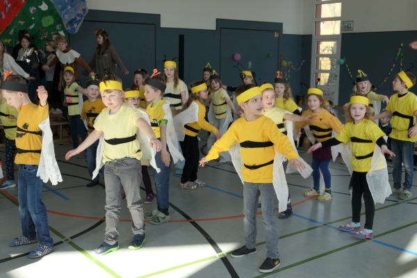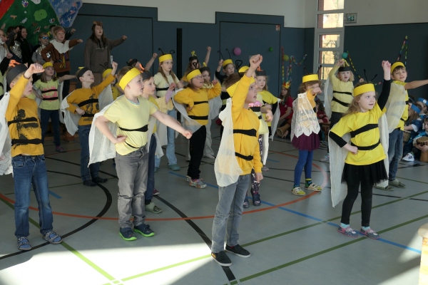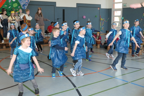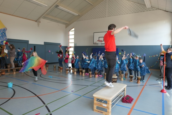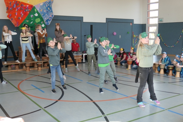 In nur wenigen Tagen haben wir uns in Bienen, Oktopusse, Morgenlandkatzen und Papageien verwandelt, haben gesungen, getrommel und getanzt und hatten jede Menge Spaß! So ist bei der Aufführung von “Trommelinho und die Farben dieser Welt” der Funke schnell auf die Zuschauer übergesprungen und am Ende haben alle “Unser Regenbogen malt den Himmel an …” mitgesungen.